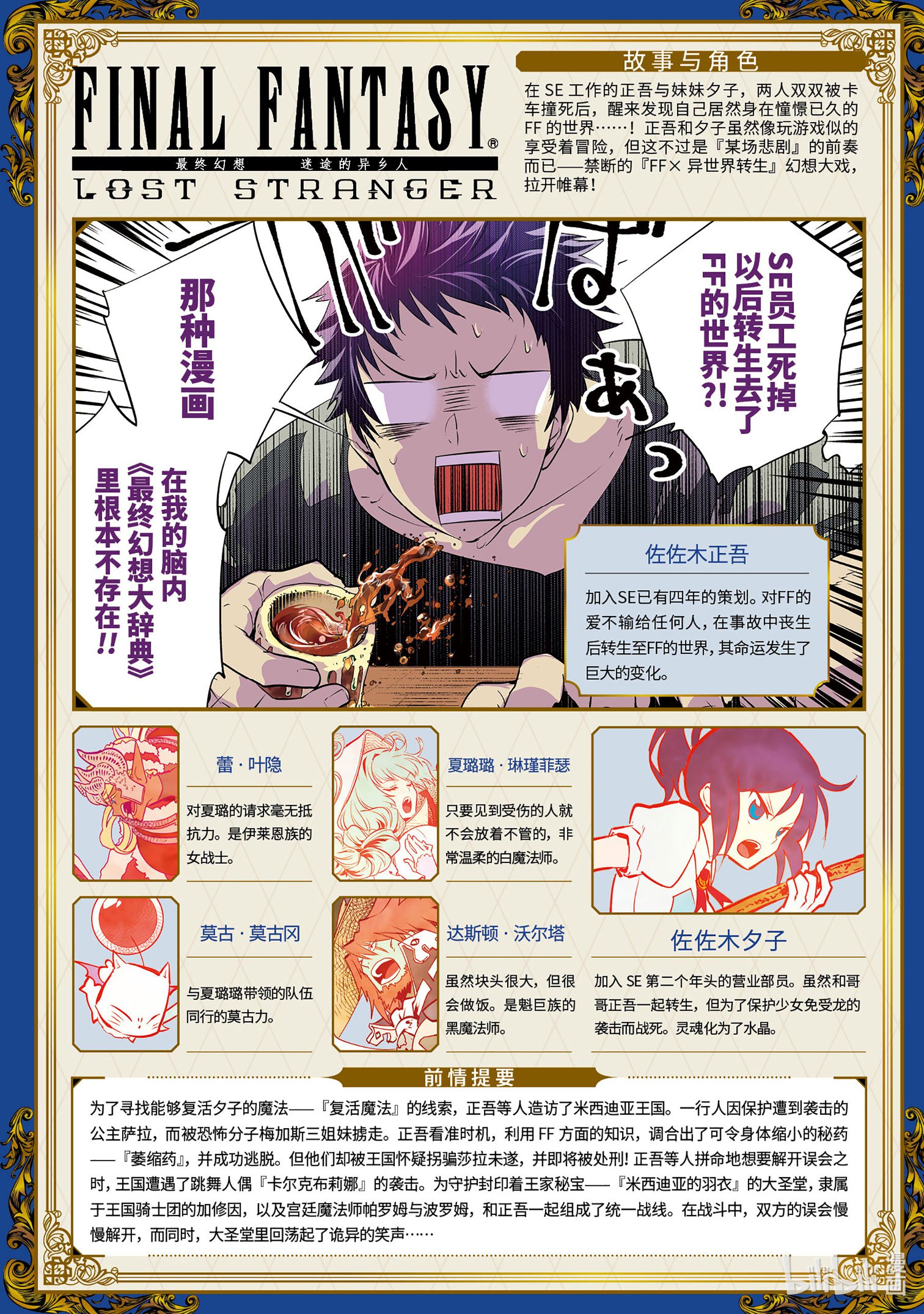 简介史克威尔艾克尼斯在全世界享有超高人气的代表作「最终幻想」系列作品。憧憬FF,梦想能制作FF而进入史克威尔艾尼克斯工作的正吾,现实里却每天都被与FF毫无关系的工作给追着跑。在营业部妹子・夕子的鼓励下,正想要转换一下烦闷的心情时,突然一辆失控的卡车向二人袭来——!!下一秒,当正吾醒来之时发现那里居然有—莫古力!!?超疗伤!!??陆行鸟。来到的是一个不属于任何系列的FF世界。FF的狂热粉丝正吾,将在这如何生存!?