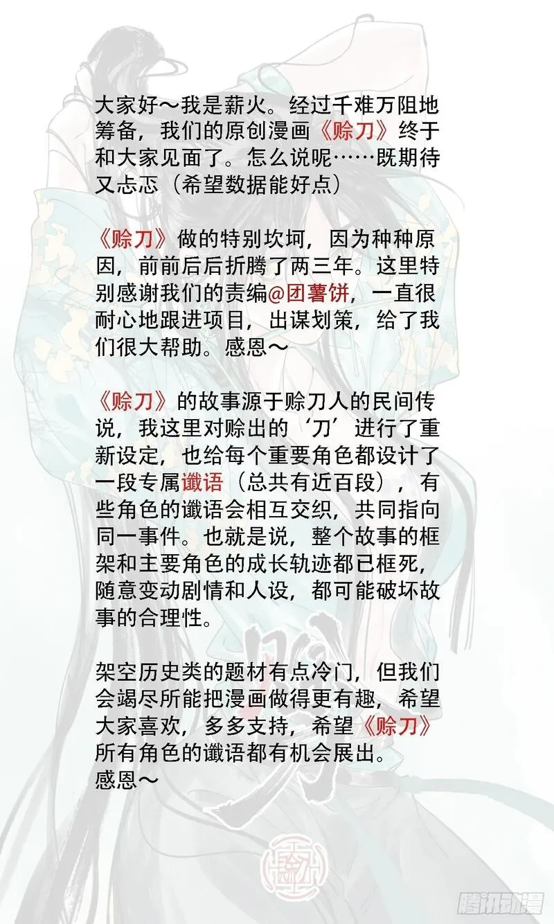 赊刀又名,类型为格斗|热血的高人气漫画,漫画简介:每逢乱世灾年,赊刀人便会出现,将合适的铩刀赊给有缘人,不收分文,只留下几句谶语。待谶语应验之时,再来收取“刀资”。出身贱籍的树羽从赊刀人唐刀那儿赊到了一把名为“木正”的铩刀,获知了自己的谶语,并得到了...